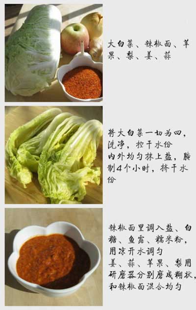 大白菜、辣椒面、蘋果、梨、姜、蒜、鹽、白糖、魚露、糯米粉。
